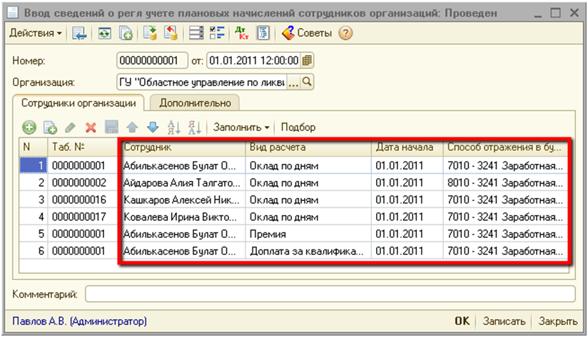 При начислении заработной платы сотрудникам производится автоматическое распределение различных форм оплаты труда по статьям бюджетной классификации, согласно установленным долям распределения.