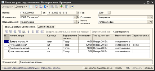 Осуществляется сбор заказов от подразделений на приобретение в ближайший период товаров, работ и услуг в рамках годового плана государственных закупок. При оценке/утверждении заказа возможно отслеживание превышения количества запрошенных номенклатурных позиций над годовым планом при помощи инструмента анализа.