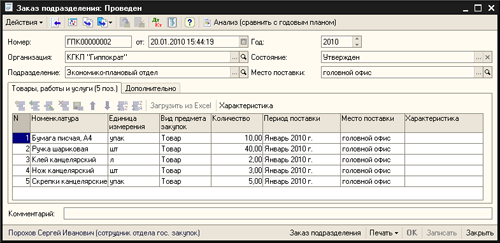 - Регистрация поступающих от подразделений заказов на приобретение товаров, работ и услуг, контроль соответствия заказов утвержденному годовому плану.