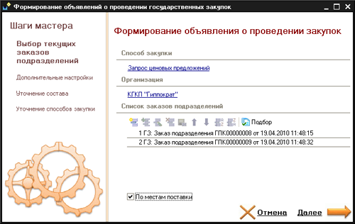 Вариантов формирования объявлений несколько, и они определяют, будут ли в объявление перенесены все номенклатурные позиции из заказов подразделений, либо будет произведен ручной отбор, либо отбор по способам закупки.