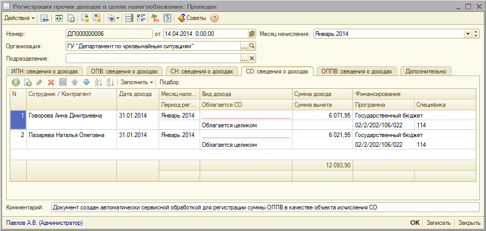 В документах, созданных автоматически с помощью обработки, поле «Комментарий» заполняется текстом «Документ создан автоматически сервисной обработкой для регистрации суммы ОППВ в качестве объекта исчисления СО».