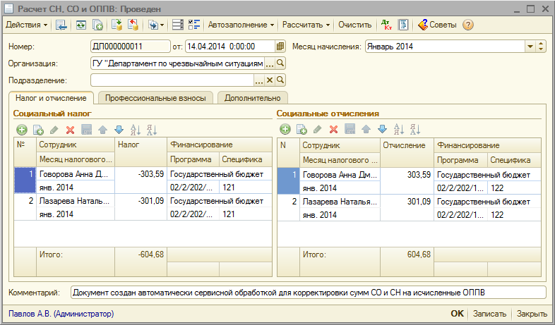В документах, созданных автоматически с помощью обработки, поле «Комментарий» заполняется текстом «Документ создан автоматически сервисной обработкой для корректировки сумм СО и СН на исчисленные ОППВ».