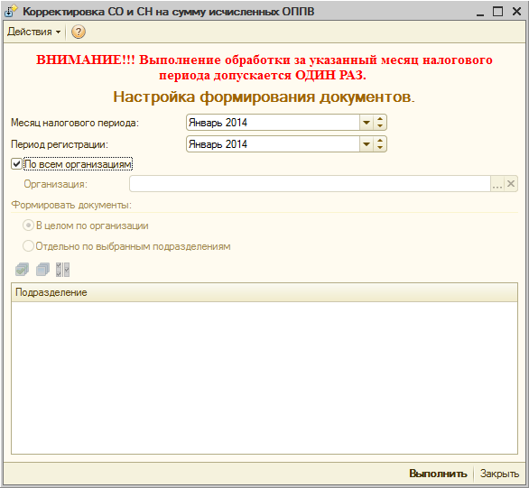 При нажатии на кнопку «Выполнить» в программе формируются документы, корректирующие суммы исчисленных СО и СН.