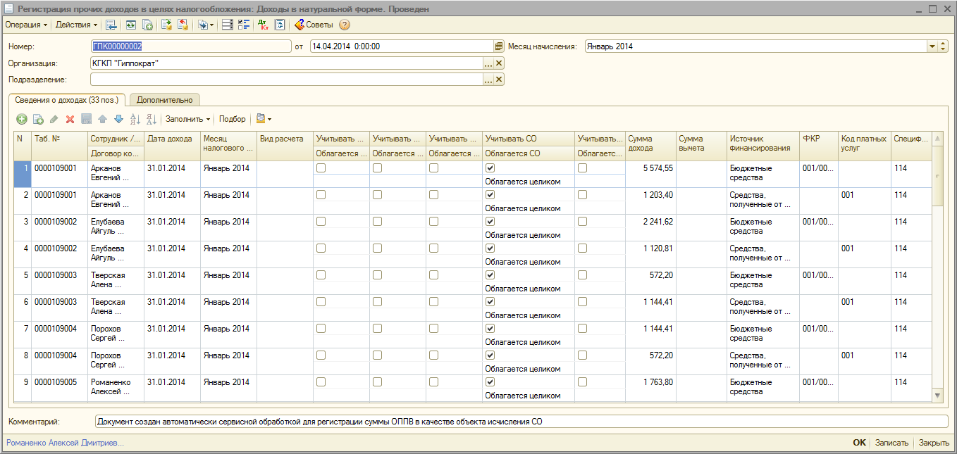 В документах, созданных автоматически с помощью обработки, поле «Комментарий» заполняется текстом «Документ создан автоматически сервисной обработкой для регистрации суммы ОППВ в качестве объекта исчисления СО».