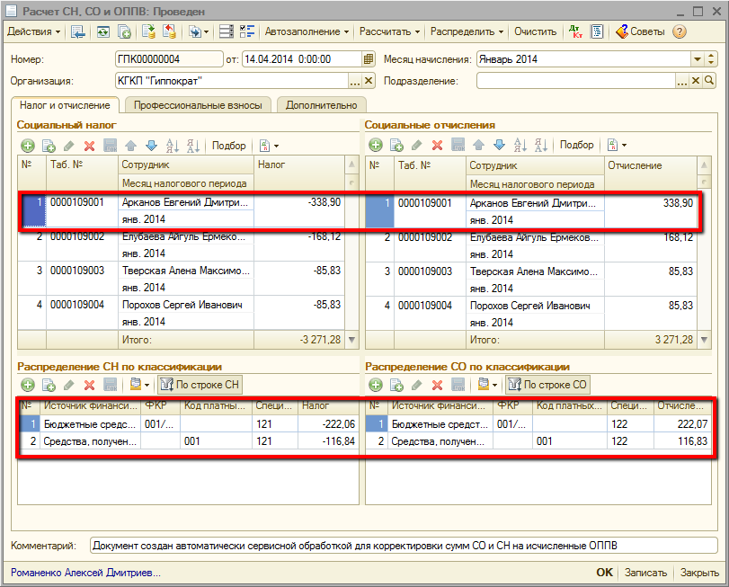 В документах, созданных автоматически с помощью обработки, поле «Комментарий» заполняется текстом «Документ создан автоматически сервисной обработкой для корректировки сумм СО и СН на исчисленные ОППВ».