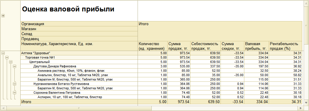 В «1С:Аптека для Казахстана» формируется более 30 видов аналитических отчетов с разным уровнем группировки и детальными расшифровками по всем видам операций. Представлены абсолютные значения показателей за период, средние значения, динамика показателей с течением времени и относительные показатели эффективности торговых операций. Особое внимание уделено анализу продаж, как в разрезе товарных групп, так и групп покупателей, оценке эффективности применяемых скидок, распродаж.