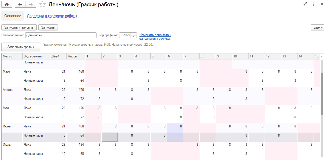 указание рабочих смен на каждый день цикла и даты начала отсчета (дата, с которой начинается цикл графика).