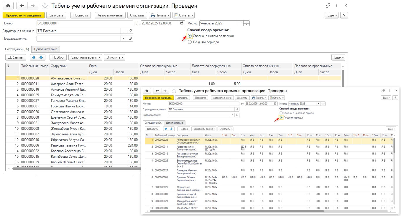 ввода времени: сводно, в целом за период, и по дням периода.