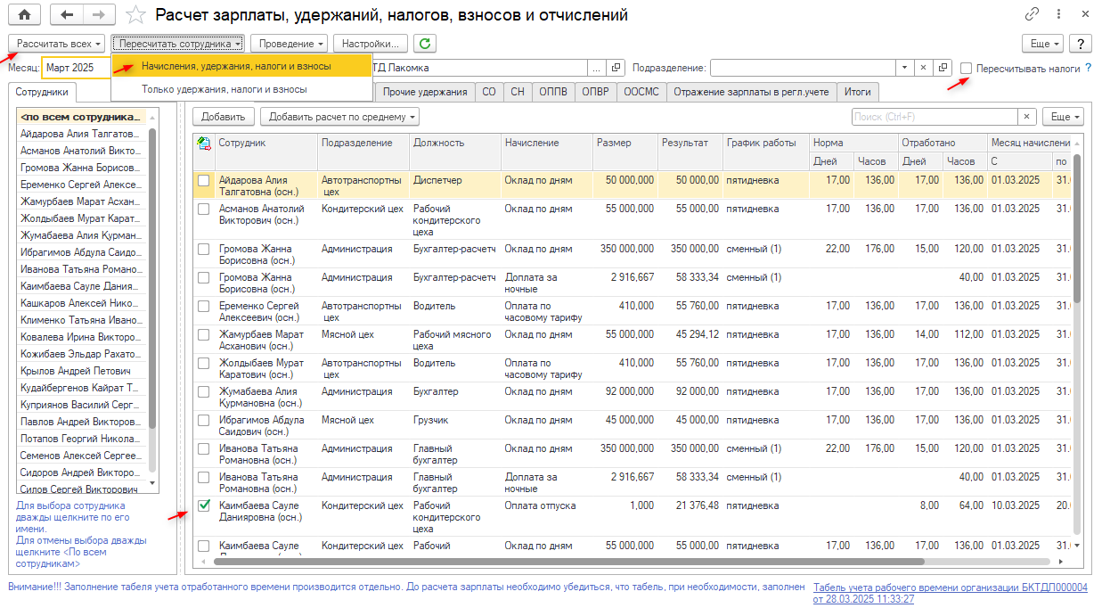 всех» — «Пересчитать введенные пользователем начисления, удержания, налоги и