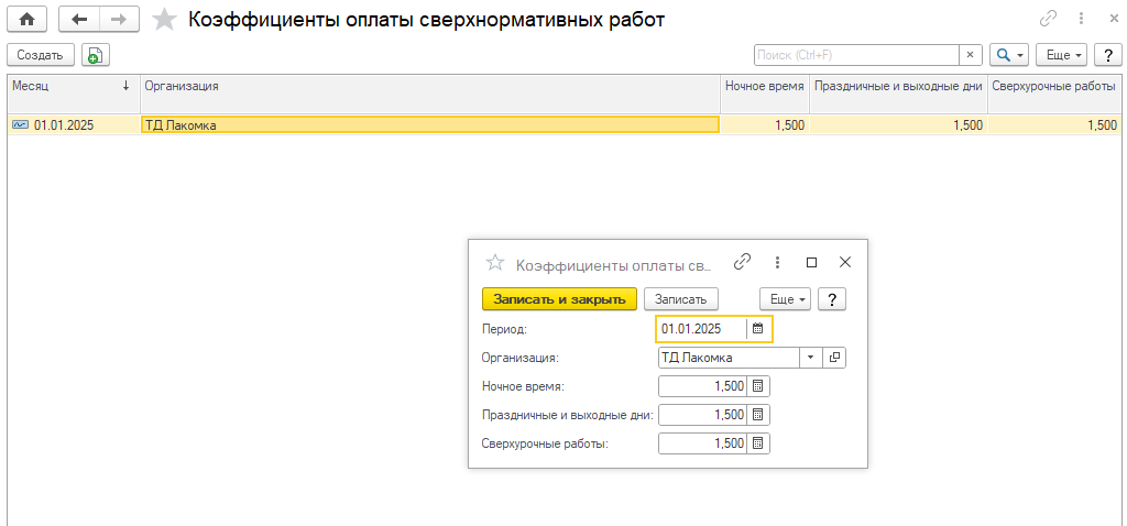 В регистре сведений «Коэффициенты оплаты сверхнормативных работ» хранится информация о размере