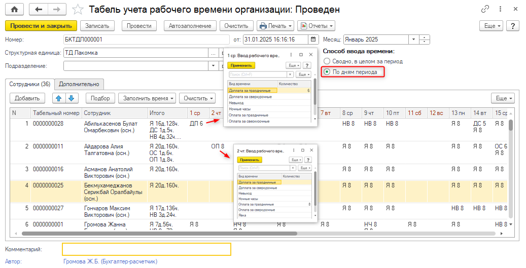 «Табель учета рабочего времени организации» со способом ввода данных «По дням периода»